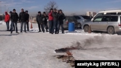 Жеңиш Молдокматов акция учурунда сүйлөп жатат.