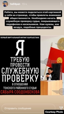 Кыргызстанда социалдык тармактын колдонуучулары Тоң райондук сотунун судьясы Сабыр Содонбековго каршы виртуалдык митингге катышууда.